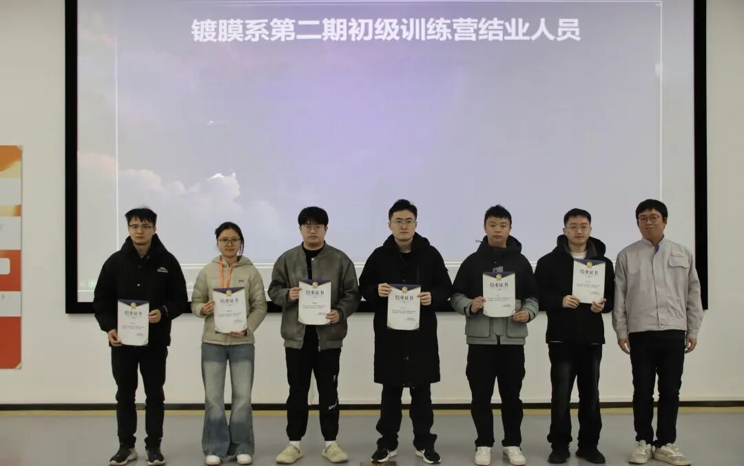 1月22日,水晶光电工程学院镀膜系第二期初级训练营圆满结营。公司总经理、用人部门代表、镀膜系导师及学员等近40人出席。经过3个月系统学习,22名学员顺利结业。本期镀膜训练营从实际产品为导向,课程涵盖客户需求识别、最佳实践案例、失效分析与改善等核心内容。自10月开营以来,采用"理论培训+实操练习+课后答疑+毕业答辩"的培养模式,有效提升学员从需求分析到问题解决的系统化能力,实现理论知识向现场问题解决的转化,获得学员与用人部门100%推荐。